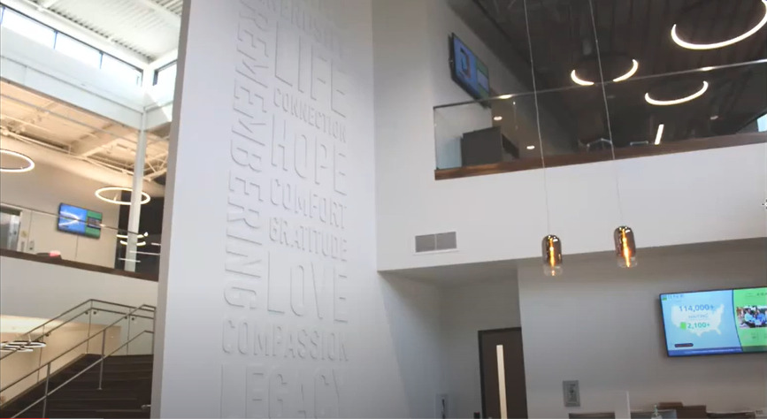 The Donor Network is planning to add opportunities to honor organ donors and their families in the new location and make the space inviting for visitors. Upon entering the building, you can see the beautiful word wall that displays words often associated with transplants, like hope, remembrance, and compassion. All words that family and recipients use. The lighting is very strategic to let in natural light, and there are two living walls covered in plant life.